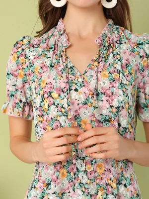 - Floral Pattern, Chiffon Fabric, Tie Neck, Puff Short Sleeves