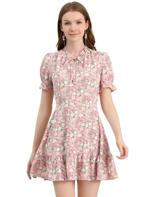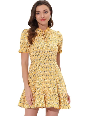 Dainty blooms charm this figure-flattering mini styled with a ruffled tie neckline. Frilly ruffles float at the neck, sleeves, and hem of this enchanting floral frock. Chiffon gives crisp structure to the statement tie neckline of this flared dress. Looks lovely in this pretty dress with bow-tie neckline and a sweet, above-the-knee ruffle hem. Occasion: Coffee Shop, Daily, work, etc.
