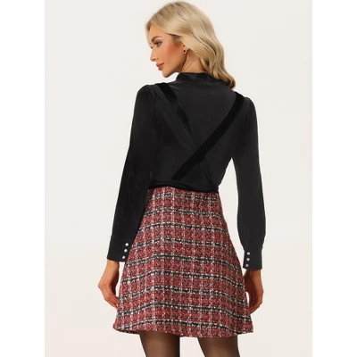 Elevate your wardrobe with this timeless A-line tweed plaid suspender skirt from Allegra K! Featuring adjustable suspenders and contrast velvet decor, this skirt is designed to fit all body types comfortably. Add a touch of glamour to your look with a stylish ankle boot and a fitted knit or a fancy tie-neck shirt.
