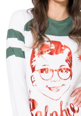 Get ready for the holidays by cozying up to classic holiday movies on the couch in this A Christmas Story Ralphie raglan nightgown. The gown features Ralphie’s face on front, green and white striped sleeves and is made from a comfortable, soft fabric that will warm you on winter nights. For questions regarding sizing, please refer to size chart.