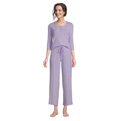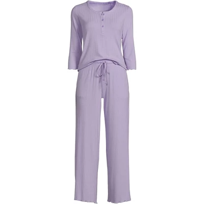 Ready for your beauty sleep? Slip into this adorable cropped set. Made of a lightweight, breathable rib knit fabric, it features a three-quarter sleeve top with a scoop neck style you can button or unbutton and matching cropped pants with a drawstring waist. Both pieces have a stylish lettuce edge finish you’ll love, plus you can wear each one separately, making this a truly versatile set.