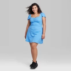 Fit and flare knit mini dress from Wild Fable™ with ribbed texture in a solid hue. Designed with a ruched-front sweetheart neckline and square back. Made of a stretchy, extra-lightweight cotton-blend fabric for comfortable wear that moves with you. Short cap sleeves complete the cute look.