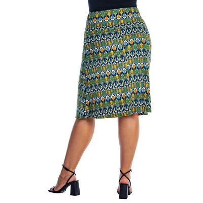Introducing our Green Geometric Elastic Waist Knee Length Plus Size Skirt, where fashion meets versatility in a captivating blend. This exquisite skirt features a knee length design adorned with an enchanting geometric pattern in vibrant shades of green. Meticulously crafted with attention to detail, it effortlessly combines elegance and comfort. The elastic waistband ensures a flawless fit, allowing for all day wear with ease. The high quality fabric gracefully drapes, enhancing your natural silhouette and exuding confidence. Perfect for both professional settings and casual outings, this skirt is a must have wardrobe staple. Embrace the allure of geometric patterns and elevate your style with our Green Geometric Elastic Waist Knee Length Skirt.
